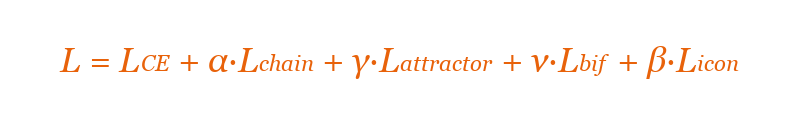 where L_CE is standard cross-entropy for next-token prediction, L_chain encourages interpretant consistency across adjacent positions (Peirce’s unlimited semiosis as a temporal constraint), L_attractor encourages attractor-subspace clustering by interpretive basin, L_bif supervises the BEN’s bifurcation estimates against ground-truth divergence labels, and L_icon correlates phonological and semantic features (disabled in Stage 1, β = 0).