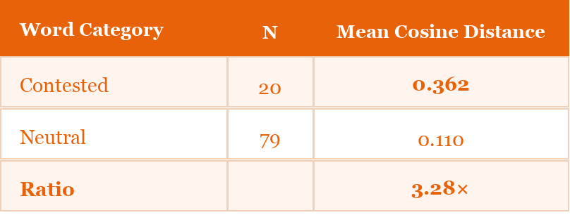 Second, community differentiation is achievable but fragile. The model can learn to produce interpretant vectors that differ by 3.28× between communities for contested terms, but this signal is sensitive to training conditions.